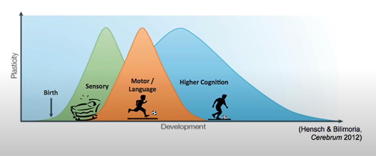 Es gibt bestimmte Phasen, in denen die Neuroplastizität (siehe Neuroplastizität) besonders hoch ist. Siehe Kritische Entwicklungsphasen